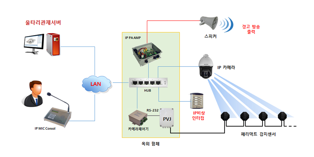- 울타리 감지 센서 침투 감지 시 해당 구역의 개별 그룹 자동 경고 방송